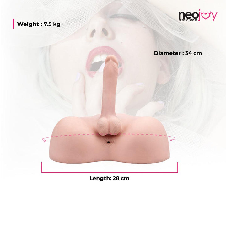 Featuring two naughty and firm balls, the realistic member of this toy is perfect for sitting on and straddling. Hide him in a safe place and bring him our to play whenever you fancy. The skin-like material he's been made of (TPE) and the realistic size (7.5kg) will give authenticity to the entire sexual experience. Skin-safe, phthalate-free and waterproof, this super realistic doll is every lady's desire. Men can play with him, too, as he features an intensely textured anal hole, making him the best threesomes partner.