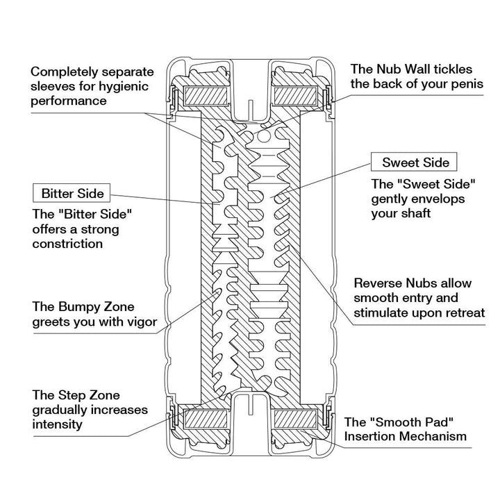 The 'Bitter Side' firmly tightens, whilst the 'Sweet Side' gently clings to the penis.